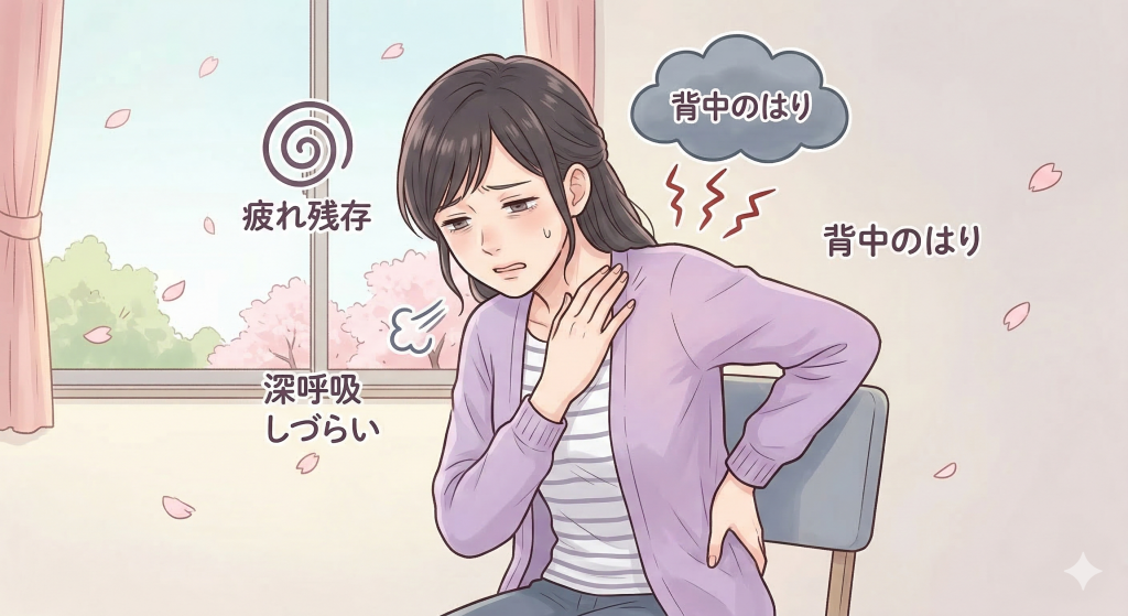 その結果として現れやすいのが、背中の張り、呼吸の浅さ、疲労感、だるさ、寝ても回復しにくい感覚です。