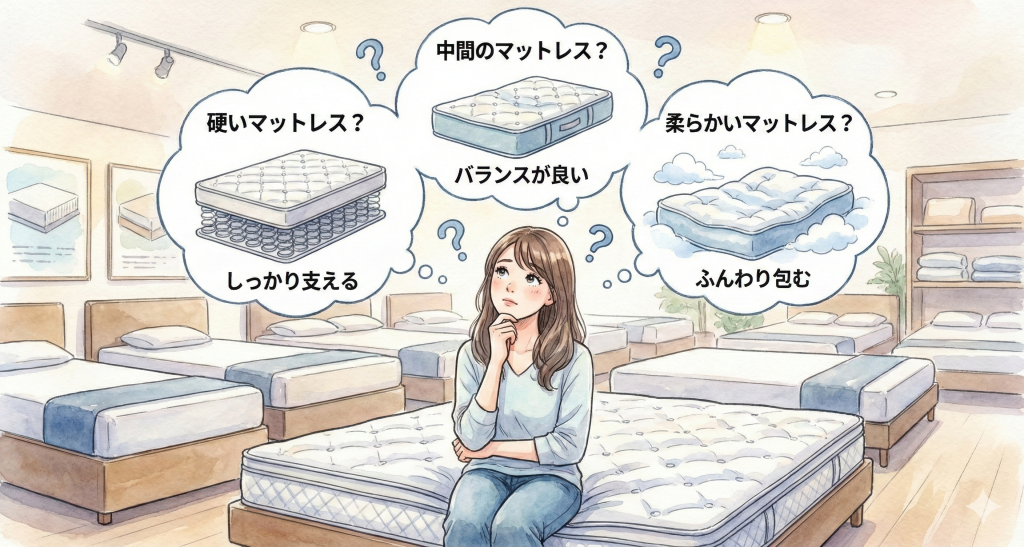 腰痛の方がやりがちな失敗は「腰が痛いから硬いものが正解」と決めつけることです。硬すぎると肩や骨盤が沈まず、腰が浮きやすくなります。逆に柔らかすぎると骨盤が沈み、腰が反りやすくなります。どちらも腰に負担がかかります。