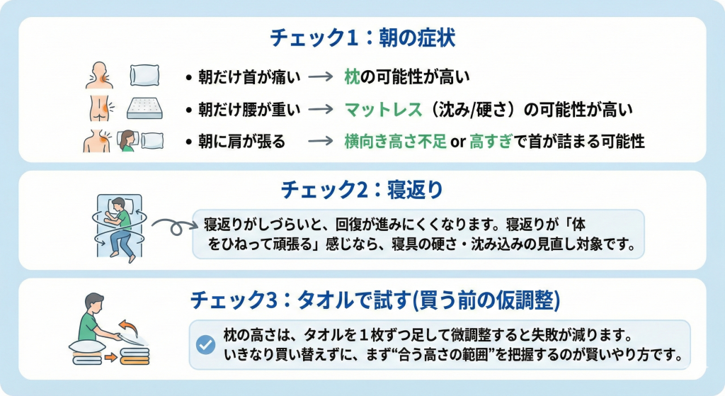 - 朝だけ腰が重い → マットレス(沈み/硬さ)の可能性が高い